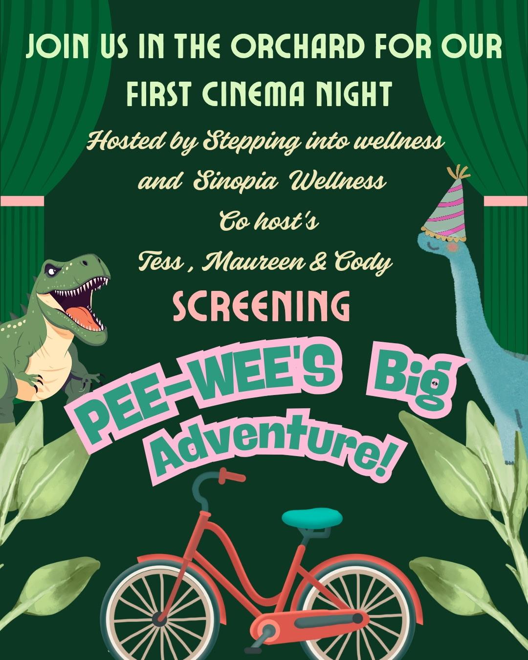 Join us in the orchard for our first Cinema Night, co-hosted by Stepping Into Wellness and Sinopia Wellness, with co-hosts Tess, Maureen & Cody. We’re screening Pee-Wee’s Big Adventure under the stars — bring your friends, your blanket, and your sense of fun!